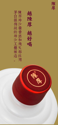 簡 介3: 北京陳厚酒業有限公司屬貴州陳厚酒業有限公司分公司。貴州陳厚酒業有限公司創始于上世紀七十年代,前身為仁懷縣茅臺釀造一分廠、茅臺鎮國貴宴酒廠。歷經幾十年的艱苦拓業,由一個釀酒作坊發展為專業從事醬酒生產、供應、銷售的市級規模企業。占地面積60余畝,4萬平方米廠房。有包括25名釀酒專業技術人員在內的400多名員工。現代化的勾調、過濾、檢測和自動灌裝設備,先進的化驗室。擁有質量監督檢驗檢疫總局頒發的《全國白酒工業生產許可證》。