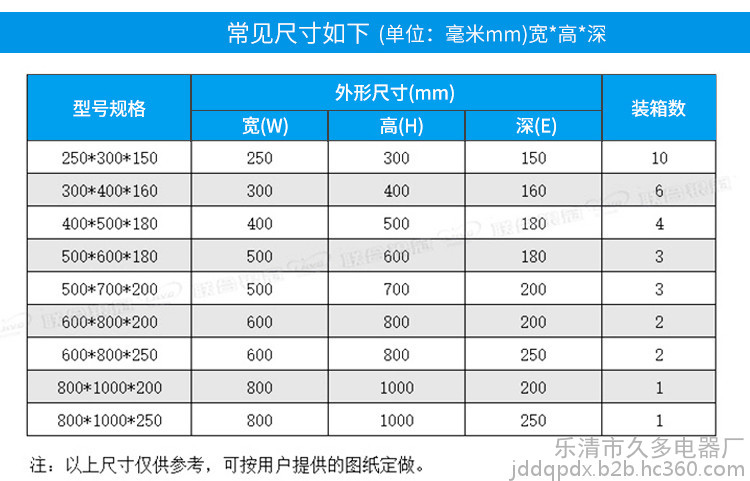 簡   介: 樂清市久多電器廠坐落在浙江樂清市柳市工業區,交通便 捷,至溫州機場及火車站幾十分鐘路程,近靠七里港口、享有“中國電器之都” 的美譽。同時,與風景區——雁蕩山、楠溪江毗鄰。 公司主要產品有:不銹鋼配電箱、不銹鋼電表箱、不銹鋼配電柜、不銹鋼基業箱、不銹鋼JP柜、不銹鋼光伏箱、不銹鋼計量箱、不銹鋼監控箱、不銹鋼戶內外配電箱、不銹鋼動力柜、不銹鋼農網柜、不銹鋼干式變壓器外殼、不銹鋼高低壓箱體、不銹鋼橋架及各類不銹鋼非標箱和成套設備等系列產品,質量可靠,外形美觀,產品廣泛應用于輸配電、機械、冶金、水電、石化、輕紡、礦山、交通等行業和隧道、建筑、舊城改造、城市農村電網改造以及其它建筑項目配套、單機使用和民用。不銹鋼配電箱產品銷往全國各地,具有很高的性能價格比,深受廣大用戶的信賴與好評。   公司嚴守“”的宗旨,從軟、硬件上建立了一套嚴格的質量管理體系,本公司專業生產不銹鋼配電箱、高低成套設備等系列產品。 真誠歡迎經銷商在各地設立銷售分公司,共同發展。 歡迎新老客戶前來蒞臨指導,洽談合作!