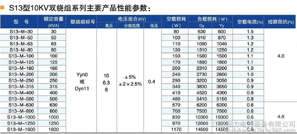 S13型是我公司在原S11配電變壓器基礎上,通過新材料、新工藝的研究運用及自主創新與技術引進結合的方式,通過對鐵心及線圈結構的優化創新設計,達到降低空載損耗及噪音的目的。自主開發的產品。