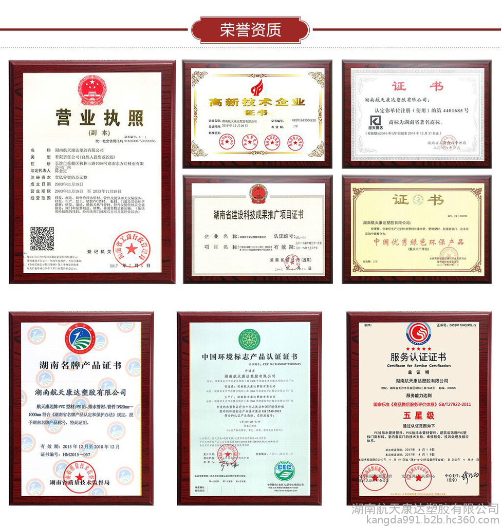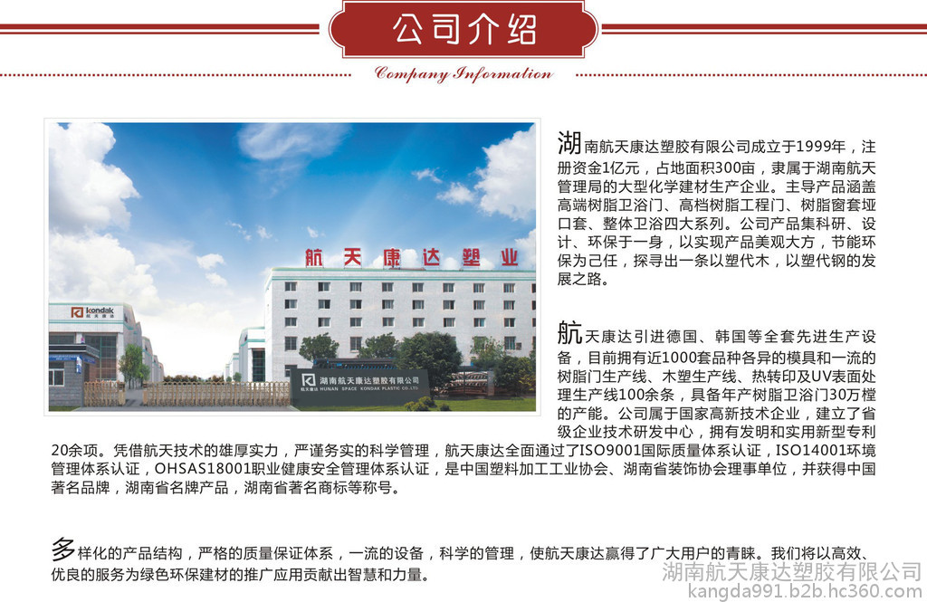 簡   介: 湖南航天康達塑膠有限公司成立于1999年,注冊資金1.01億元,是一家原隸屬于湖南航天管理局的新型建筑材料企業。主要從事住宅產業化環保建材產品和大口徑新型智慧城市管網的研發、生產、銷售。公司自成立以來,始終秉持“誠實、守信、創新、圖強”的經營理念,始終堅持“航天品質、康達制造”的工匠精神。公司同時在長沙、岳陽等地設有生產制造基地,年產值超過5億元。其產品攬括了樹脂門、柜體、集成墻頂、窗套埡口、各類新型管道等五大產品體系。 航天康達憑借航天技術的雄厚實力,嚴謹務實的科學管理,全面通過了ISO9001國際質量體系認證、IS014001環境管理體系認證、OHSAS18001職業健康安全管理體系認證、“十環認證”。 航天康達被授予高新技術企業,且連續7年被湖南省和長沙市列為省“小巨人計劃企業”;2014年被列為湖南省“專、精、特、新”示范創業;2016年再次被長沙市科技局評為“長沙市技術創新示范企業”;2017年獲得省質量技術監督局“產品連續六年經省級以上檢驗機構檢驗合格企業”等。