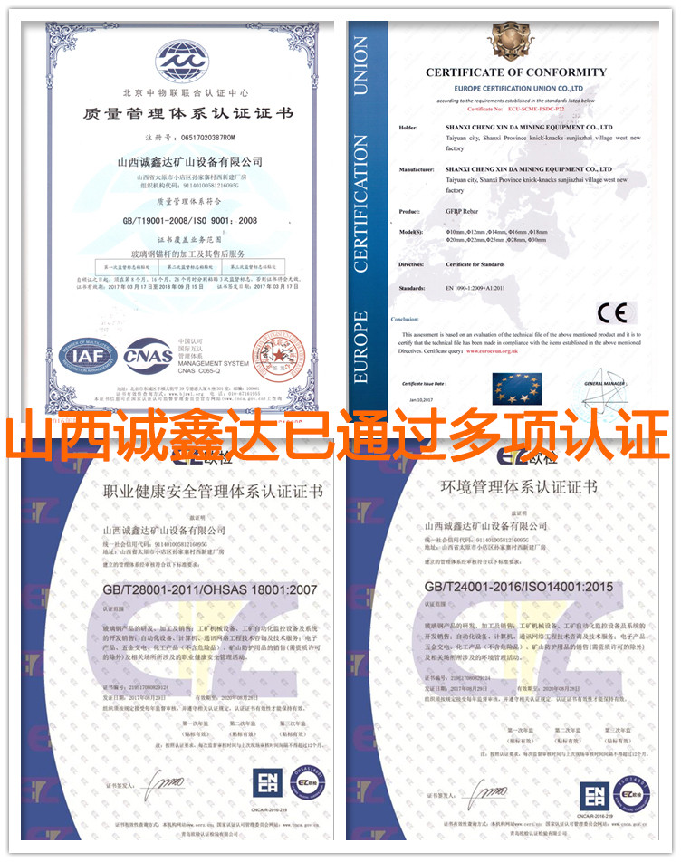山西誠鑫達成立于2011年,注冊資金3001萬元,總部位于山西省太原市小店區,是集新型復合材料研發、生產、銷售的高科技生產型企業,公司生產的全螺紋玻璃鋼錨桿、全螺紋玻璃纖維筋,在同行業率先通過ISO9001:2008 GB/T 19001-2008質量管理體系認證, ISO14001:2004 GB/T24001-2004環境管理體系認證,OHSAS18001:2007GB/T 28001-2011職業健康安全管理體系認證,并被認定為“AAA級質量、服務誠信單位,AAA級信用企業,AAA級重合同守信用企業”。