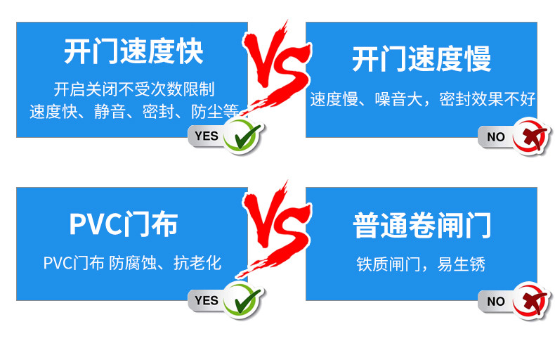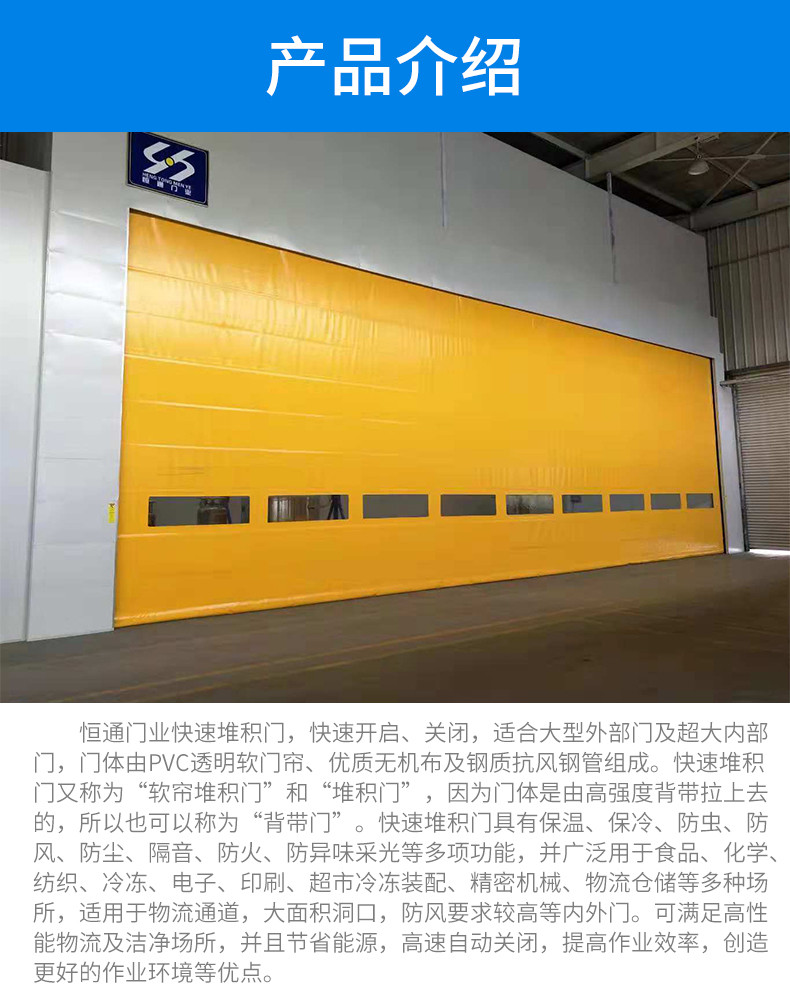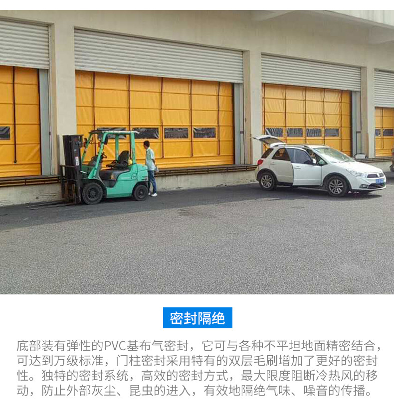 | 密封性能 | 堆積門門簾底端裝有加重隔氣布,它可與各種不平坦的地面嚴密結合,門框兩側滑道 | |