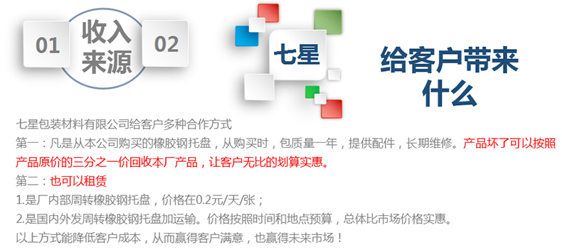 合肥七星包裝材料有限公司,自成立以來以環境環保智能為設計理念,集生產銷售租賃托盤綜合性的經營模式。以環保資源不浪費為宗旨,主要產品有:橡膠鋼托盤、橡膠包裝箱、橡膠倉儲籠、橡膠墊板、定制各種型號托盤支架,獨特的設計理念全國僅此一家,以上產品深受廣大客戶好評,本廠將在未來更好的研發新產品,為迎合智能時代的到來與更好的服務我們的客戶而努力!從合肥崛起的七星包裝材料有限公司,致力打造環保產品,鑄就輝煌強企。本公司大膽改革,超越極限,志存高遠,讓傳統工藝與高新技術恰當結合。我們用科學資源,文化凝聚力量,鑄就品質價值,用品牌與服務交流,贏取市場。七星包裝材料有限公司,歡迎客戶前來洽談合作,我們將給予各種方式合作,讓客戶滿意。