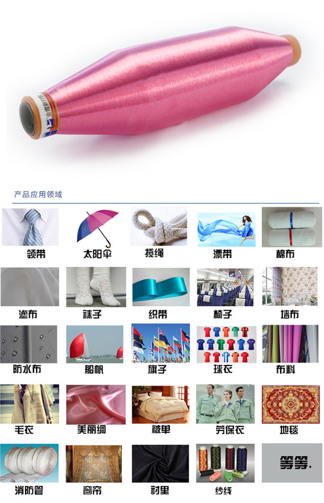 用途:編織網管、電線套管、三明治網布、織帶、繡花、服裝輔料、濾布、床墊、工藝品、造紙網、商標、花邊、發飾品、雪紡布、婚紗、雪紡帶、印刷絲網、鞋材、窗紗、箱包、釣魚線等。