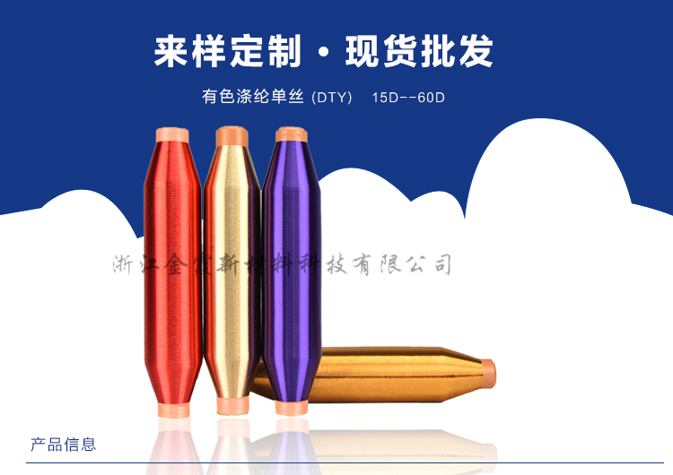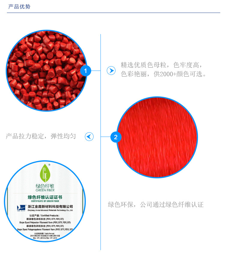 簡   介: 浙江金霞新材料科技有限公司成立于1998年,旗下現有上海金霞、嘉興金旭等多家分公司,位于上海經濟圈內的浙江省海鹽縣通元鎮。 本公司一直專注于差別化化纖的研發、生產和銷售,具有年產3萬噸的滌綸長絲生產能力。產品涵蓋無染滌綸復絲FDY 30D-1000D、 DTY50D-600D和無染滌綸單絲15D-60D。研發并已成熟穩定生產多種功能性無染滌綸長絲,包括無染環保阻燃滌綸長絲、無染夢幻多色滌綸長絲、 無染異形聚酯單絲、 無染生態抗菌高感滌綸長絲、無染細旦涼感滌綸長絲、 無染負氧離子滌綸長絲等等。 產品被廣泛運用于服飾面料、地毯、戶外帳篷、絲帶、座墊、窗簾、床上用品、墻布、內衣、運動服等。還可根據客戶的不同需求,量身定做各種個性化產品。
