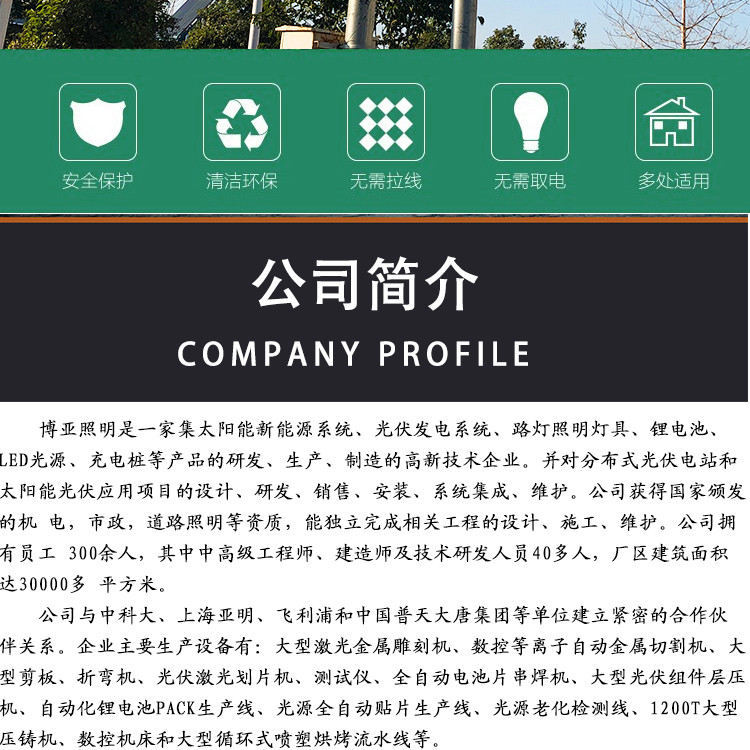 簡   介: 博亞照明是一家集太陽能新能源系統(tǒng)、光伏發(fā)電系統(tǒng)、路燈照明燈具、鋰電池、 LED光源、充電樁等產(chǎn)品的研發(fā)、生產(chǎn)、制造的高新技術(shù)企業(yè)。并對分布式光伏電站和太陽能光伏應(yīng)用項(xiàng)目的設(shè)計(jì)、研發(fā)、銷售、安裝、系統(tǒng)集成、維護(hù)。公司獲得頒發(fā)的機(jī) 電,市政,道路照明等資質(zhì),能獨(dú)立完成相關(guān)工程的設(shè)計(jì)、施工、維護(hù)。公司擁有員工 300余人,其中中級工程師、建造師及技術(shù)研發(fā)人員40多人,廠區(qū)建筑面積達(dá)30000多 平方米。 公司與中科大、上海亞明、飛利浦和中國普天大唐集團(tuán)等單位建立緊密的合作伙伴關(guān)系。企業(yè)主要生產(chǎn)設(shè)備有:大型激光金屬雕刻機(jī)、數(shù)控等離子自動(dòng)金屬切割機(jī)、大型剪板、折彎機(jī)、光伏激光劃片機(jī)、測試儀、全自動(dòng)電池片串焊機(jī)、大型光伏組件層壓機(jī)、自動(dòng)化鋰電池PACK生產(chǎn)線、光源全自動(dòng)貼片生產(chǎn)線、光源老化檢測線、1200T大型壓鑄機(jī)、數(shù)控機(jī)床和大型循環(huán)式噴塑烘烤流水線等。 公司已通過ISO質(zhì)量、環(huán)境和職業(yè)健康管理體系,獲得CQC認(rèn)證、金太陽認(rèn)證和CCC 認(rèn)證。并獲得”江蘇省質(zhì)星、服務(wù)、誠信AAA級企業(yè)”、“江蘇省重質(zhì)量守信譽(yù)誠信施工單位”、“江蘇省民營科技企業(yè)殊榮。擁有市級認(rèn)定的企業(yè)技術(shù)中心,有自己的光電實(shí)驗(yàn)室檢測中心。 博亞照明以發(fā)展綠色照明產(chǎn)業(yè)為己任,運(yùn)用先進(jìn)的制造工藝,精優(yōu)的產(chǎn)品質(zhì)量,合理的市場價(jià)格,和完善的售后服務(wù),嬴得廣大客戶的信賴和認(rèn)可。 博亞照明堅(jiān)持“品質(zhì)創(chuàng)造高端價(jià)值”的原則,愿與國內(nèi)外的新老客戶坦誠合作,共同為創(chuàng)造藍(lán)天碧水、沁心宜人的綠色家園而努力奮斗。