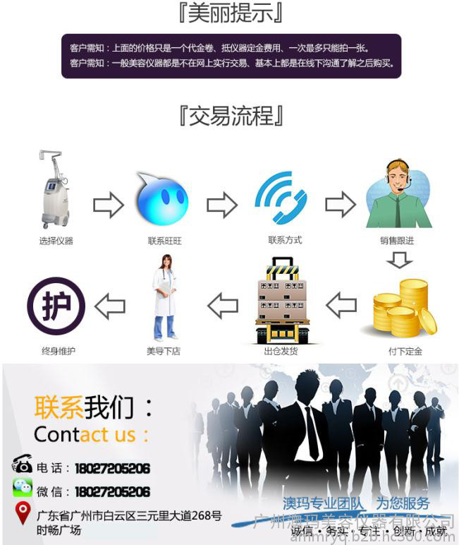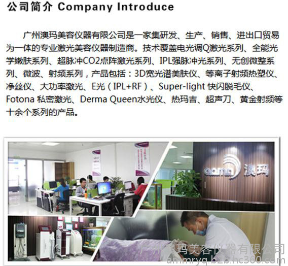 簡   介: 廣州澳瑪美容儀器有限公司是一家集研發、生產、銷售、進出口貿易為一體的專業皮膚管理儀器制造商。澳瑪人兢兢業業,不斷進取,贏得了廣大客戶的信賴和良好的市場口碑。我們始終堅持以市場為導向、客戶至上的原則;做到準確把握市場,始終走在科技前沿,致力于開發高品質,高效率的產品取信于客戶,服務于客戶。