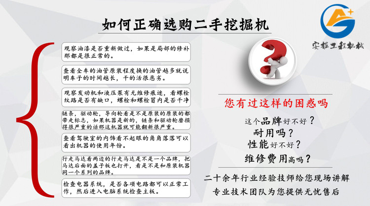 本公司主營:卡特、KOMATSU、日立、神鋼、住友、沃爾沃、久保田、三一、現代、斗山、山河智能、玉柴等品牌大中小微型二手挖掘機,常年備貨三千臺左右,品牌型號齊全,選擇空間大