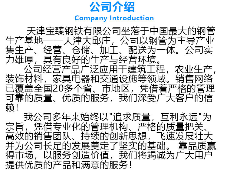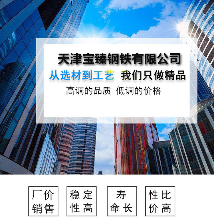 天津寶臻鋼鐵有限公司坐落于鋼管生產基地——天津大邱莊,公司以鋼管為主導產業,集生產、經營、倉儲、加工、配送為一體。公司實力雄厚,具有良好的生產與經營環境。 公司經營產品廣泛應用于建筑工程,農業生產,裝飾材料,家具電器和交通設施等領域。銷售網絡已覆蓋全國20多個省、市地區,憑借著嚴格的管理、可靠的質量、優質的服務,我們深受廣大客戶的信賴! 我公司多年來始終以"追求質量,互利永遠"為宗旨,憑借專業化的管理機構、嚴格的質量把關、高效的銷售團隊、持續的創新思想,飛速發展壯大,并為公司長足的發展奠定了堅實的基礎。 靠品質贏得市場,以服務創造價值,我們將竭誠為廣大用戶提供的產品和滿意的服務!