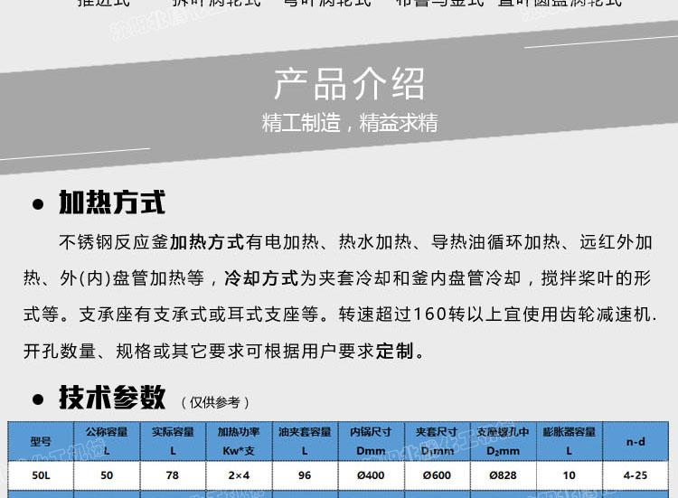 不銹鋼反應(yīng)釜加熱方式有電加熱、熱水加熱、導(dǎo)熱油循環(huán)加熱、遠紅外加熱、外(內(nèi))盤管加熱等,冷卻方式為夾套冷卻和釜內(nèi)盤管冷卻,攪拌槳葉的形式等。支承座有支承式或耳式支座等。轉(zhuǎn)速超過160轉(zhuǎn)以上宜使用齒輪減速機.開孔數(shù)量、規(guī)格或其它要求可根據(jù)用戶要求設(shè)計、制作。