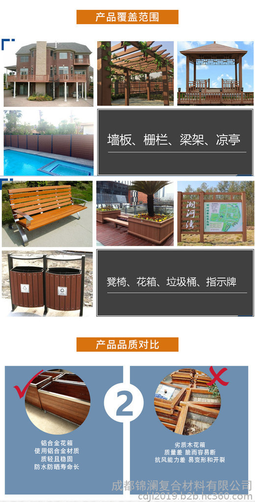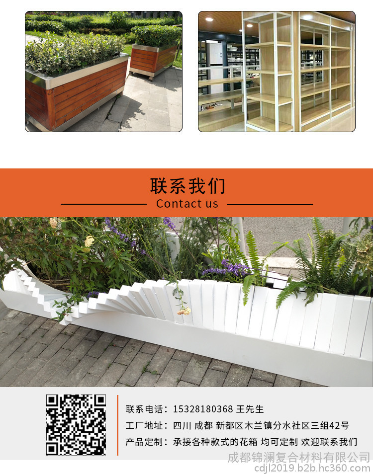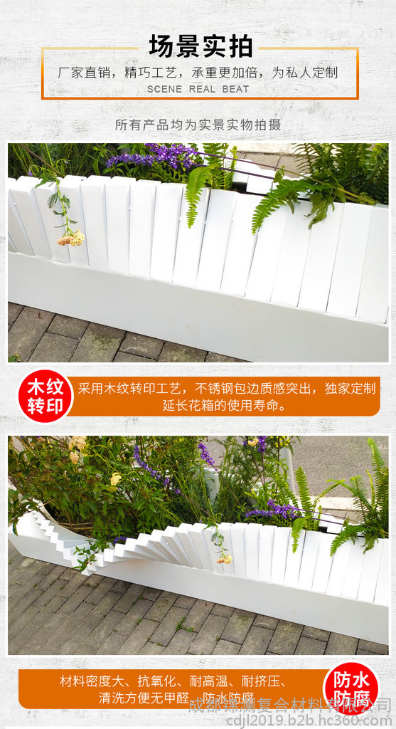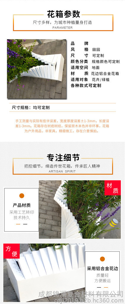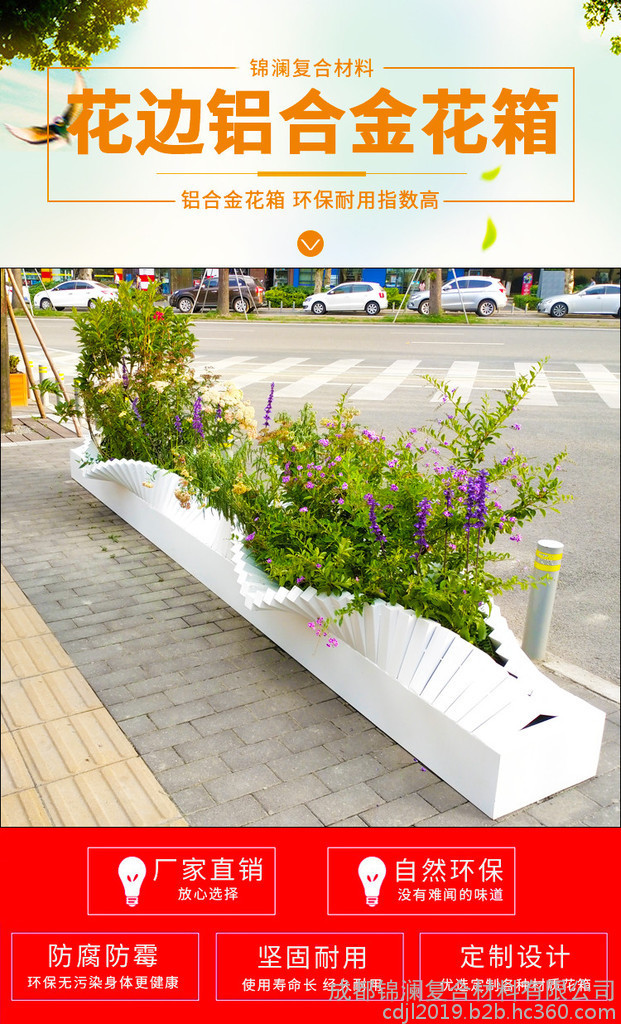 成都錦瀾復合材料有限公司是一家專業生產鋁合金花箱、塑木花箱、防腐木花箱等多樣化花箱的生產銷售廠家。公司產品款式新穎、風格獨特,可根據要求定制,本廠位于四川成都,交通便利,地理位置優越,風景秀美。 本廠生產的產品廣泛適用于的生活小區、休閑廣場、城市街道、園林綠化、商業樓宇、星級賓館、工廠、醫院、學校等各行各業。本廠對產品細節有著苛刻的要求,生產出的產品以其款式新穎、美觀大方、質量可靠、安全耐用、耐腐蝕、抗撞擊、能適應惡劣氣候等優點深受廣大客戶的喜愛。 成都錦瀾復合材料有限公司成立于2016年,為了貫徹“品質有保證、客戶有信心”的理念;在嚴格品質控管的生產流程下,產品合格率高達百分之九十五,在多年的銷售實踐中,公司積累了豐富的生產實踐經驗,確保生產出好的花箱制品。因其好的質量、迅捷的交貨及好的服務而得到廣大客戶的認可,并逐步建立起長期、穩定的合作伙伴關系。 本著“誠信經營、以人為本、開拓創新、以質取勝”的經營理念。不懈努力,與時俱進,做大做強企業。真誠希望與廣大新老客戶共創美好的明天。