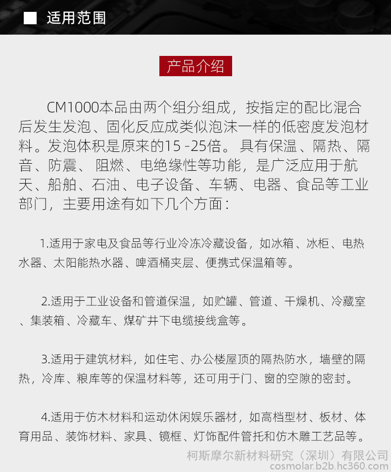 簡   介: 柯斯摩爾CosMolar是專注膠粘劑、密封劑等新材料研發、生產、銷售的高新技術品牌。是國內外新能源、軍工、醫療、航空、船舶、電子、汽車、儀器、電源、高鐵、通訊等行業粘合劑、密封膠等新材料的研發定制解決方案的提供商。公司本著“品質保證,客戶至上”的企業經營理念,“誠信經營、信譽為本”的經營宗旨。堅信客戶永遠是公司發展的源泉,堅持以市場為導向,以完善的售后服務為承諾,我們積極參與推廣以及行業交流活動,公司在長期的發展過程中以過硬的產品質量的優勢和國內許多大型的公司都建立了長期良好的合作伙伴關系,我們也熱誠歡迎國內外客戶來我司考察,參觀及技術交流;廣納博交的企業精神,愿與社會各界朋友精誠合作,共創美好家園!