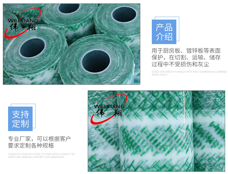 簡   介: 常州偉翔保護膜坐落在聞名世界風景秀麗的魚米之鄉長江三角洲:芙蓉鎮。水,陸,空交通十分便利 公司創建于2000年,擁有一批高素質的工程,管理,技術人員和先進設備,優質的化工原料,專業生產表面保護膜。產品廣泛應用于塑料型材、鋁板、鍍鋅板、不銹鋼板、彩鋼板、玻璃、亞克力、大理石、塑鋼、鋁塑板、鋁合金、地毯、地板、廚具板、家電、UV裝飾板、防火板等表面保護。本公司已通過IS9000國際質量體系認證。產品達到國內同類產品先進水平。產品遍布國內各個省市,并遠銷東南亞,歐美,中東等多個國與地區,是在國內具實力的保護膜品企業之一。 工廠有強大而可靠的質量管理體系,使產品屢次獲得消費者“信得過產品”及“科技創新產品”的榮譽稱號。 企業宗旨;質量保障,服務至上 本公司與多家國內知名大型廠家直接配套。我公司以真誠服務,客戶至上與服務上門為經營宗旨! 歡迎各客戶來人來電洽談業務,我們將竭誠為您服務。 我們真誠與您相邀共創美好明天!