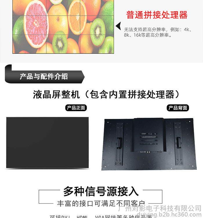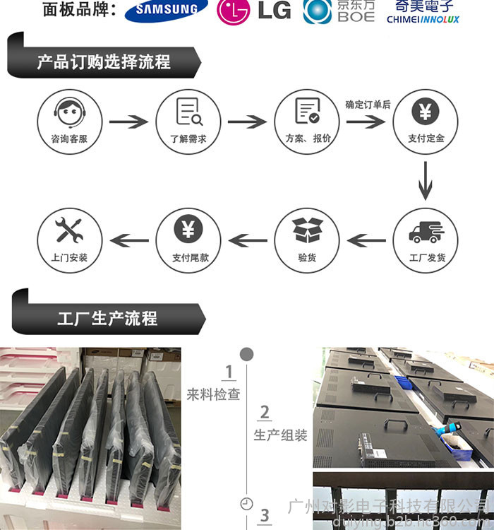 廣州對影電子科技有限公司是一家致力于液晶拼接墻、液晶廣告機、教學、會議一體機、全彩LED屏、等產品研發、銷售、安裝與服務為一體的高新技術型企業。 對影科技始終堅持以研發創新打造核心競爭力,一直持續加大研發投入并不斷致力于技術創新。每年將營業額的20%投入到研發中,公司的技術人員占員工總數的35%以上,從根本上保證了技術的持續創新的能力。 同時,公司采用國際化的現代管理模式,導入ISO9001:2008質量管理體系,并通過了CCC、CE、IEC、ROHS等認證。所有產品均經過嚴格測試,產品性能參數優于行業標準,立志為用戶制造值得信賴的高附加值產品。 對影科技擁有一支專業敬業、即時響應的高效客戶服務隊伍,又形成了以廣州、深圳、北京、上海、南京、成都、武漢、西安、鄭州、杭州、昆明等十多個中心城市為樞紐、覆蓋全國的區域營銷網絡,為客戶提供包括產品咨詢、工程安裝、技術支持和設備維護等全方位的貼身服務。 憑借成熟的質量管理體系、營銷網絡和售后服務系統,對影科技贏得了市場與 客戶的普遍認同,產品先后應用于平安城市、政府、場館、交通、能源、制造、金融、廣電、娛樂、醫療、教育等各個領域,遠銷海外。同三星、夏普、LG、SONY等眾多國際知名品牌建立了長期合作關系,用戶包括以萬科、沃爾瑪、體彩中心等國內外百余家企業。 對影科技本著“以客戶為中心”的服務宗旨,不斷提升產品品質,服務質量和性價比,持續為客戶創造價值!矢志成為您最可信賴的合作伙伴,為共同構建安全、和諧、輕松的高品質生活而不懈努力。