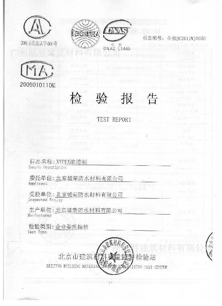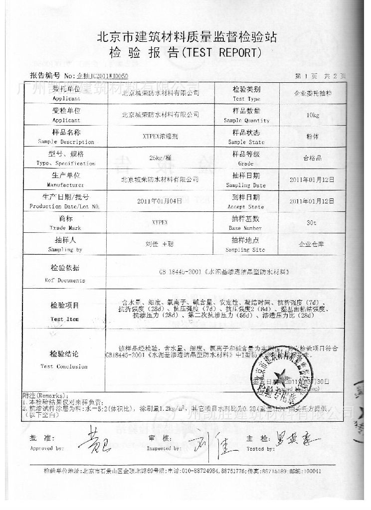 XYPEX得到世界眾多地方的衛生、健康和環保部門批準,在國內經北京市疾病預防控制中心根據《生活飲用水衛生規范》2001)檢測,檢驗結論為實際無毒產品。故可以用于應用水和食品工業用混凝土建筑結構上。