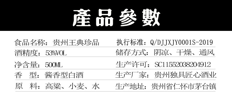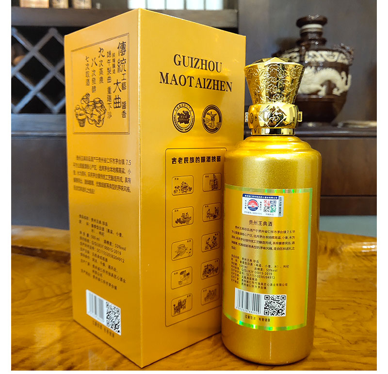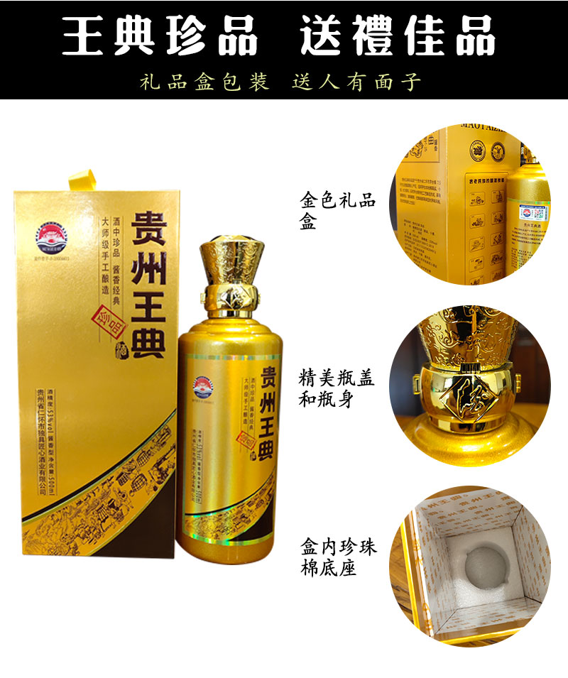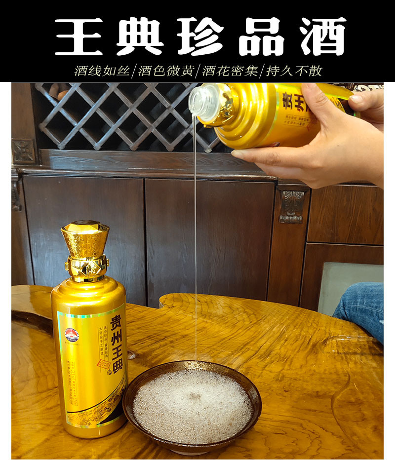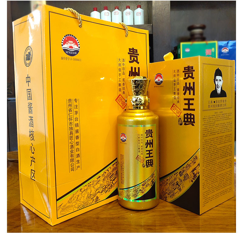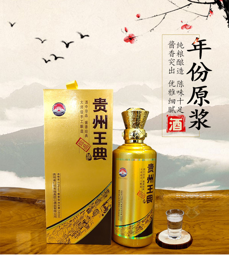 本公司主導產品為“王典”系列酒。以本地優質糯高粱,小麥為原料,取赤水河之靈泉秀水,按照茅臺酒的傳統工藝,精心釀制而成,所有成品酒,至少得經過5年的儲存時間,使酒質老熟,化驗合格后方能包裝出廠。具有醬香突出、酒體醇厚、優雅細膩、空杯留香持久的特點!