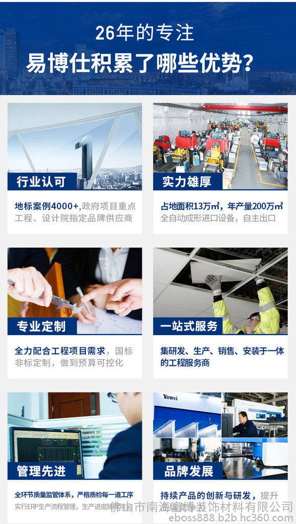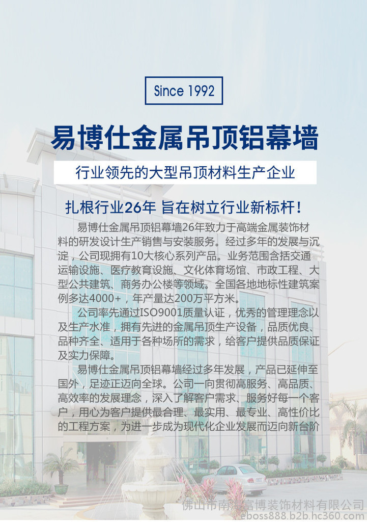 易博仕裝飾是集研發、生產、銷售、安裝于一體的工程企業單位,專業生產金屬吊頂鋁幕墻天花,公司扎根行業20余載,專業齊全的產品架構及規范化的管理理念,用實力保障質量、服務與效率。