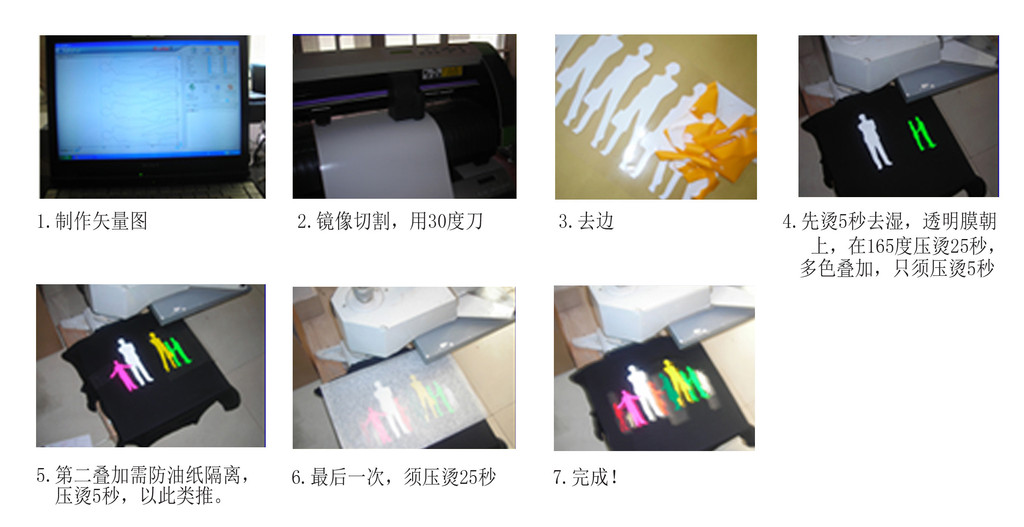 熱轉(zhuǎn)印植絨刻字膜可用常規(guī)的切割機(jī)切割,我們建議用30° 刀角的刻字刀。去除多余的邊后,然后用平板熱壓燙機(jī)器熱轉(zhuǎn)印到布料上。植絨刻字膜的背紙是自粘PET膜,自粘PET膜應(yīng)可以在熱或在冷卻的情況下撕去。