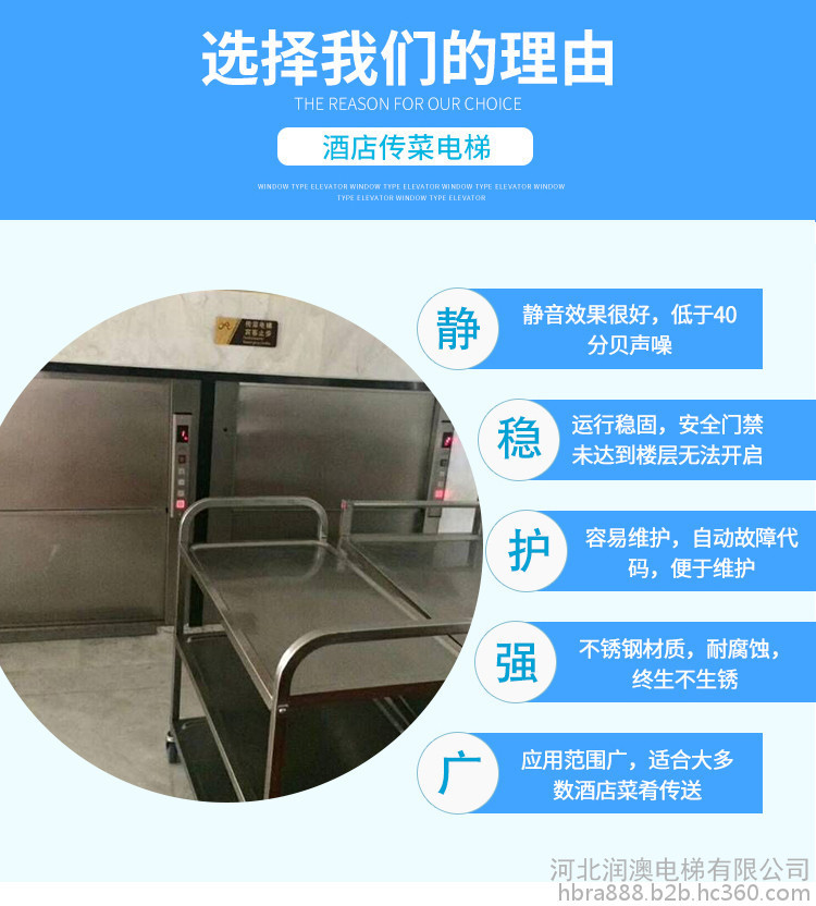 我公司生產的高質量雜物電梯,經濟節能,功能齊全,本著用戶是上帝,以求生存的原則,采用先進的歐洲技術,專業的生產,可靠的安裝,可靠及時的維修,竭誠為您的需求提供盡善盡美的系列服務。